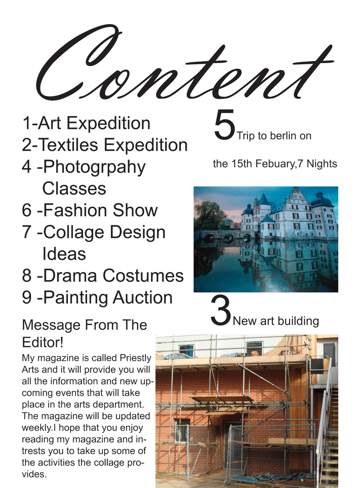 My cover name is Priestly Arts. I have chosen this because my magazine is to do with the arts department. The colour scheme that I have used is blue, black, white and pink. The pink colour is taken from a colour that is on the garment from the image. I have made it so my rhetorical questions are in the same colour also the colours are taken from the Priestley's Colleges colours. The image reflects on the art department because it is a garment that has been made in textiles by a student and been displayed at a fashion show. Having a bar code is critical and the price is important so that the customer is provided with the price of the magazine and the magazine can be scanned when it is bought. I have chosen to make my magazine weekly, so this provides updates to the students. I have put rhetorical questions on my front cover, by doing this I was hoping to attract students to be drawn in and interested to the information inside.